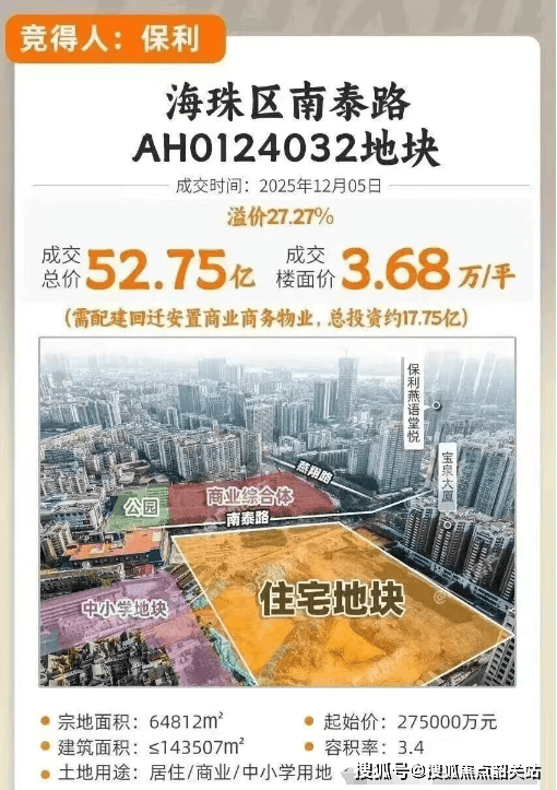 在广州海珠区西南部,一个被业内称为“海珠西终极拼图”的重磅地块——保利南泰路地块(原翠城花园东地块)正悄然酝酿一场居住格局的变革。该地块在激烈竞拍中由保利以35亿元总价斩获,叠加无偿移交商业配建成本后,总投入超51亿元。随着最新修规方案落地,其“14.3万㎡住宅+20万㎡商业综合体+优质学区+三地铁环绕+公园绿地”的全维配置,迅速成为市场焦点。为何南泰路地块被视为海珠西的新流量密码?它又将如何称霸区域楼市?