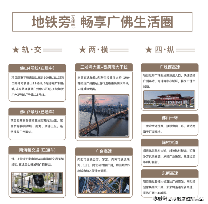 拥有3地铁1城轨(佛山地铁4号线+2号线+11号线+南海新交通),距佛山地铁4号线平顺东路地铁站100米,换乘11号线5站到广钢,地铁2号线两站直达广州南站。