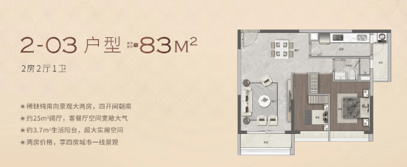 越禧府聚焦主城改善与品质刚需需求,打造71-135㎡两至四房全周期户型,所有户型均采用人性化设计,高实用率、全明通透、景观视野优越,满足不同家庭阶段居住需求。主力83㎡南向两房户型,经典方正布局,全明采光,超大面宽观景阳台,俯瞰珠江新城、广州塔城市盛景,主卧尊享飘窗设计,空间舒适实用,是主城刚需上车优选。