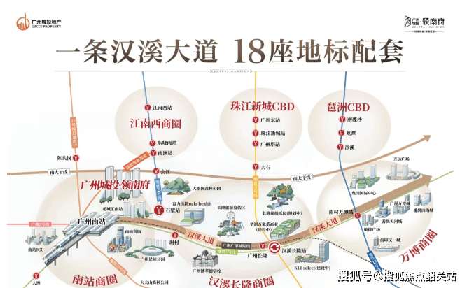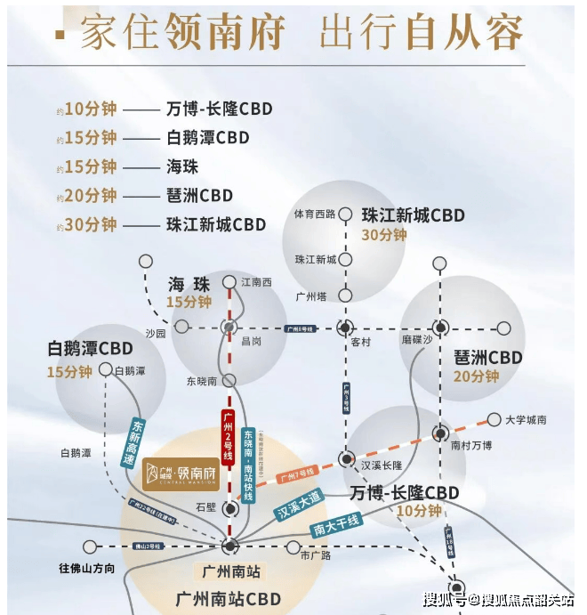 岭南府所在的南站板块拥有“一轴两涌+一核五区”的空间布局,致力于打造集文商旅为一体的综合性门户枢纽。汉溪大道贯穿多个重要商圈,包括南站商圈、江南西商圈、汉溪长隆商圈、珠江新城CBD、琶洲CBD以及万博商圈,让居民尽享都市生活的便捷。