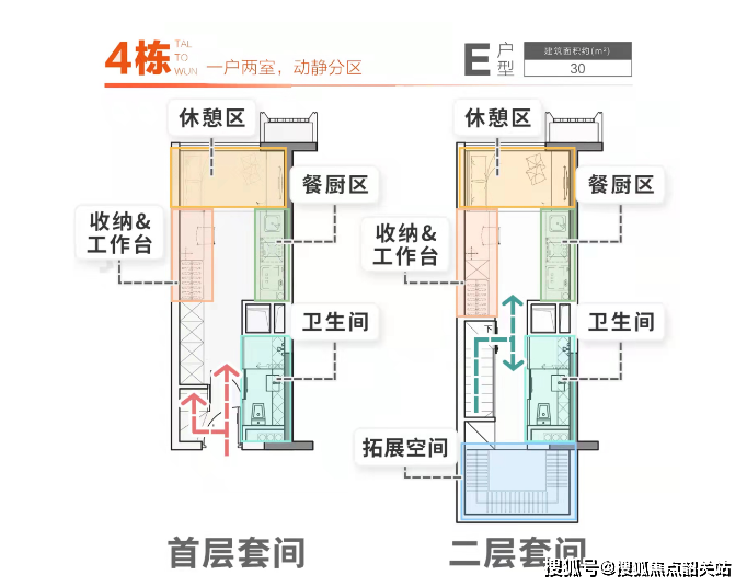 户型方面:建面约30㎡产品,层高约4.5米,户型布局科学,减少不必要的隔断,上下两层均可打造成独立套间,餐厨、卫浴、收纳、工作、休憩功能一应俱全。