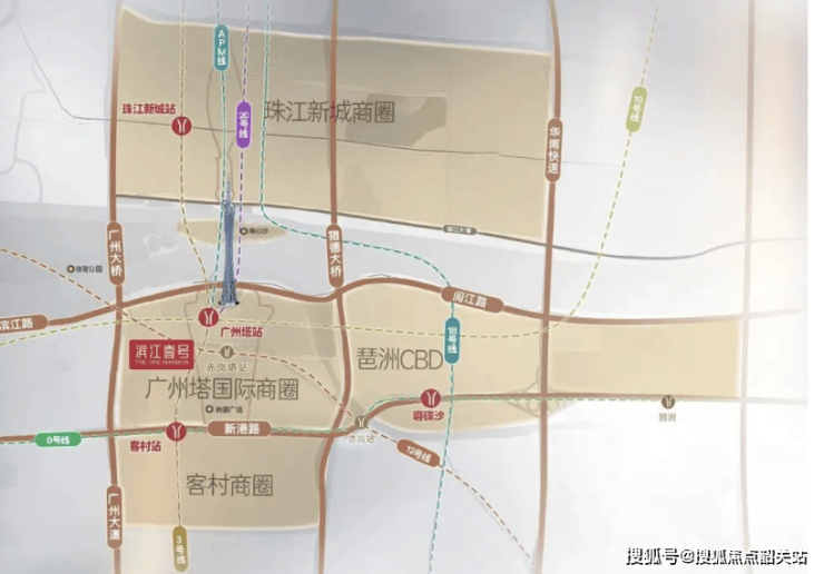 A3:项目位于海珠区广州塔板块核心,距广州塔约700米。轨道交通极为便利:步行约280米至地铁3/8号线客村站,约500米至在建12号线赤岗塔站,约700米至APM线广州塔站。通过地铁网络,2站内达珠江新城,3站内达琶洲。自驾可快速通过广州大桥、猎德大桥连接全城。