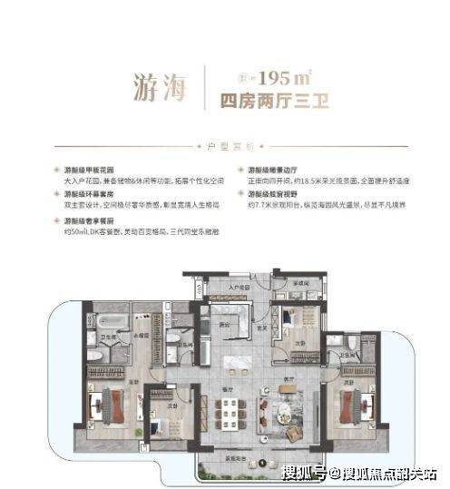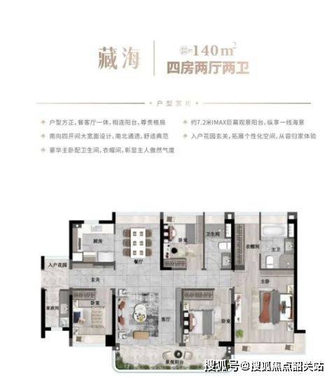 塔楼布局兼顾南向瞰海户型及园林景观面,整体风格体现滨海度假与高端住宅融合的设计理念。