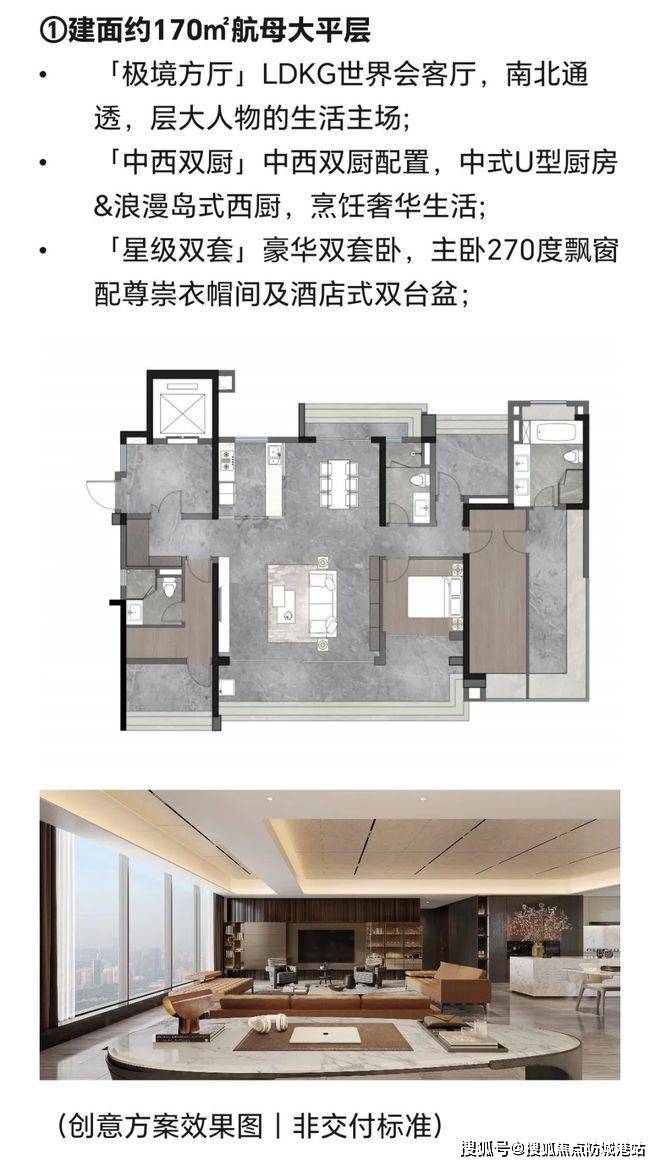 170㎡极境方厅:LDKG一体化设计,270°转角飘窗,双套卧配置,主卧面宽达3.6米,比竞品大10%-15%;