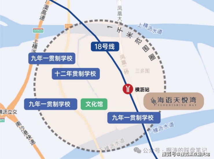 全维度公服配套环绕项目周边,构建 2 公里悠越黄金生活圈,覆盖医疗、教育、商业、生态全生活需求。医疗配套方面,板块布局两所三甲医院,中山大学附属第一医院南沙医院已正式运营,为亚洲规模领先的海陆空三维一体急救绿色通道医院,守护全龄健康;中山大学附属南沙口腔医院为国内顶尖三甲专科医疗机构,目前处于建设阶段。教育配套方面,项目 3 公里范围内整体规划 12 所各级学校,涵盖十二年一贯制学校、九年一贯制学校、公办小学与多所幼儿园,其中规划 48 班凤凰小学将于 2025 年 9 月正式开学,项目自身配建 12 班幼儿园,周边环绕湾区实验学校、广大附南沙实验学校、广州外国语学校等优质学府,形成全周期基础教育体系。