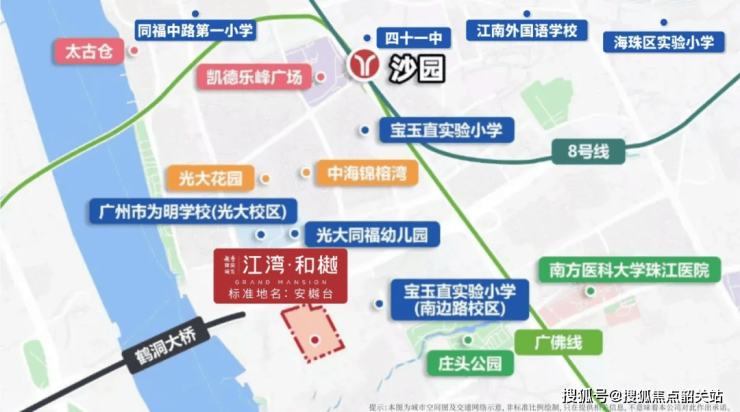 交通方面,项目距离在建的广州地铁11号线鹤洞东站约800米。作为广州首条环线地铁,11号线被誉为“换乘之王”,预计2026年全线通车后,从项目出发:3站直达芳村商圈,5站抵达北京路历史文化街区,无缝换乘1号线(通往天河体育中心)、6号线(连接海珠琶洲会展),快速通达珠江新城、金融城等城市核心功能区。即便在地铁开通前,日常出行亦极为便捷——自驾经鹤洞大桥15分钟可达海珠客村,经洲头咀隧道20分钟直达珠江新城;步行300米至鹤洞路西站,搭乘222路、995路等公交线路,可直达滘口客运站、广州火车站等交通枢纽。