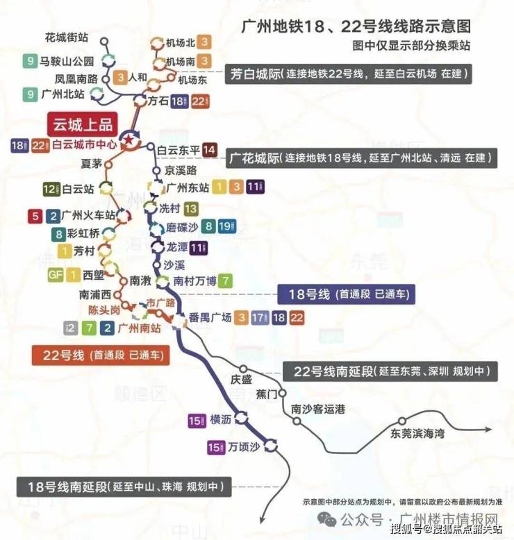 项目坐落于在建中的地铁白云城市中心站上盖,是广州中心城区内少有的双高速地铁 TOD 项目,项目地块与地铁站点实现一体化规划建设,可实现业主与轨道交通的无缝衔接。白云城市中心站规划了广州地铁 18 号线、22 号线两条最高时速 160 公里的高速地铁线路,是广州北部核心的轨道交通枢纽。通过 18 号线,项目 3 站可达广州东站,4 站直达珠江新城,可快速串联琶洲、万博中心、南沙等城市核心板块;通过 22 号线,可直达白云机场、广州南站、南沙客运港等海陆空交通枢纽,是广州唯一一条串联全市六大核心交通枢纽的地铁线路。两条高速地铁线路可实现半小时覆盖广州中心城区,一小时畅行粤港澳大湾区,全面满足业主日常通勤、商务出行、跨城出行的多元化需求。