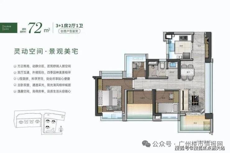 答:项目打造建面约 72-143㎡全周期三至四房户型,覆盖从刚需首置到高端改善的全维度置业需求,核心优势主要有三点:一是超高空间使用率,所有户型通过创新空间设计,实现了远超同板块常规户型的空间使用率,同等建筑面积下可获得更多实用空间;二是全周期户型设计,最小 72㎡即可实现四房格局,可满足刚需家庭一步到位的置业需求,200 多万即可上车白云城芯四房,性价比极高;三是户型设计科学合理,所有户型均实现户户朝南、全明通透,采用 LDKB 一体化设计,动静分区,兼顾实用性与舒适度,可全面匹配不同家庭的居住需求。