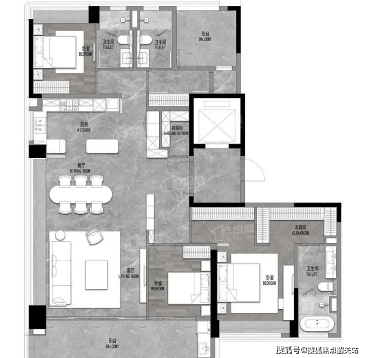 在户型设计上,招商华玺二期打破传统大平层局限。以建面约160㎡户型为例,通过约6.3米挑高空间、约20-23米南向面宽、全屋落地飘窗等设计,实现约110-116%得房率。对比市面约190㎡同类产品,该户型超级方厅面积多出25㎡,客厅开间宽出2.6米,还能拓展出一个可容纳1.8米大床的次卧,实现5房布局。建面约210㎡户型更可媲美240-270㎡空间,中西双厨、双套房设计,满足多代同堂需求。