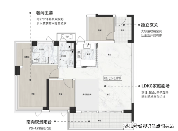 95㎡四房两厅两卫:LDKG一体化设计,约6.4米南向阳台,主卧套间带步入式衣帽间。