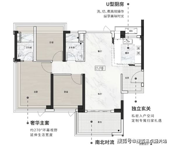 75㎡三房两厅两卫:独立玄关(可改储藏室),U型厨房,主卧套间带270°环幕视野。