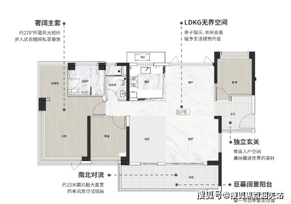 108㎡四房两厅两卫:约15米南向超大面宽,7.2米阔景阳台,南北对流。