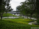 建筑外立面用了类似宋瓷汝窑的“天青色”,远看素净,近看肌理细腻。横向线条舒展,搭配大面积玻璃窗,既保留了东方建筑的沉稳感,又不显老气。尤其傍晚阳光斜照时,整栋楼泛着柔和的灰调光泽,和园林里的叠石、水景意外地和谐。