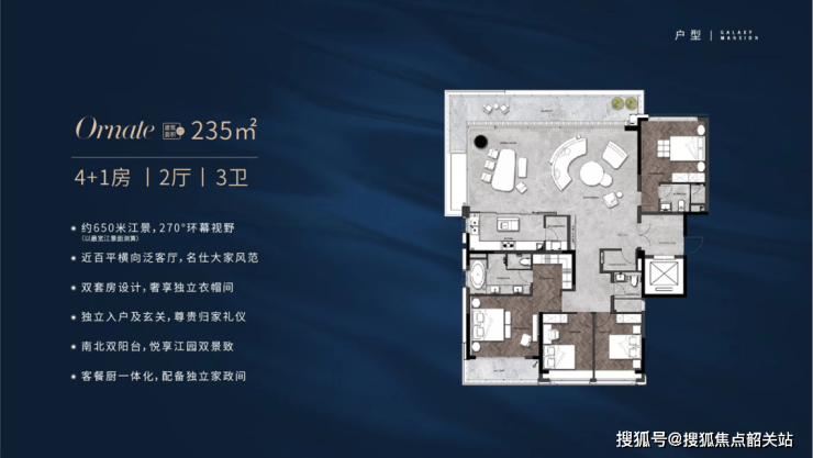 项目占据珠江前航道稀缺江景地块,所有楼栋均为东南向布局,搭配“L型转角阳台+全景飘窗”设计,实现270°环幕瞰江视野。以建面约230㎡五房户型为例,客厅面宽达8.2米,搭配约12米宽景阳台,直面珠江浩渺江面,每日可赏日出日落、江船往来。此外,项目通过“楼栋错位+层高控制”设计,确保每户均享无遮挡江景,江景资源利用率远超市场同类项目。