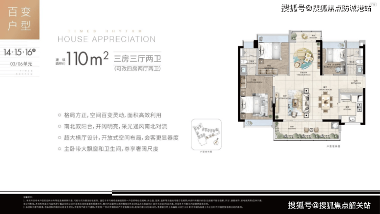 110㎡四房两卫:总价275万起,主卧带飘窗,明厨明卫