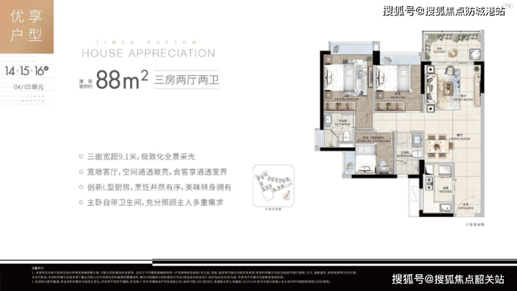 88㎡三房两卫:总价199万起,得房率78.24%,南北通透