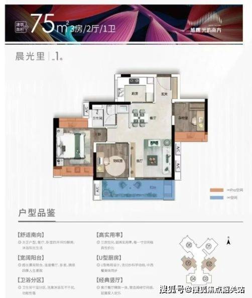 户型强调全朝南、四开间设计及动静分离,具备高实用率及大尺度阳台。部分户型双联阳台布局,可实现270°采光和通风,兼顾居住舒适性与景观视野。户型空间规划合理,满足不同家庭结构的功能需求。