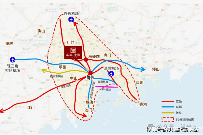 高铁与城际方面,广深港高铁南沙庆盛站距离项目不远,从庆盛站出发至香港西九龙的行车时间仅需约35分钟,进一步便利穗港两地的合作发展,强化湾区内生产要素的互联互通,让业主往返香港更加便捷;规划中的中南虎城际链接中山-广州-东莞,起于南沙,向东跨过珠江口至虎门与穗莞深城际和深茂铁路换乘,全长约28公里,可增强南沙对珠江东岸的辐射力;广中珠澳城际未来将由北到南连接机场、多个重要的大湾区城市,同时与广深港、穗莞深琶州支线、深茂高铁等联网,实现一线通达多个重要区域,进一步完善项目的跨城交通网络。此外,规划中的大岗机场建成后,将1小时实现串联接驳五大机场(广州、香港、澳门、深圳、珠海),让业主的长途出行更加便捷高效。