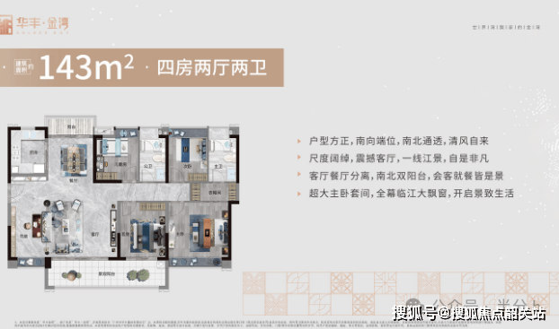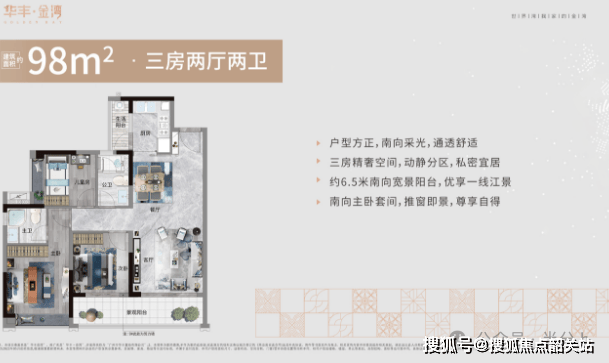 华丰金湾目前在售产品涵盖98㎡三房、115-125-143㎡四房、196㎡五房,在售均价为3.2-4.1万/㎡,具体价格根据户型、楼层、朝向、江景视野等因素有所差异。其中,98㎡三房户型均价约3.2-3.5万/㎡,总价约314-342万元;115㎡四房户型均价约3.4-3.7万/㎡,总价约391-426万元;125㎡四房户型均价约3.5-3.8万/㎡,总价约438-475万元;143㎡四房户型均价约3.7-4.0万/㎡,总价约529-572万元;196㎡五房户型均价约3.9-4.1万/㎡,总价约764-804万元。