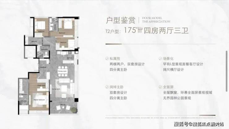 最大的175㎡四房是重头戏,整个户型布局很现代,边厅的设计,直接拉伸了整个公区的采光面和观景面屋内做了双主套,两个主套呈对角线分布,应该是考虑到了两代人的作息时间不同。有意思的是,在客卫的旁边,还藏着一个小阳台。