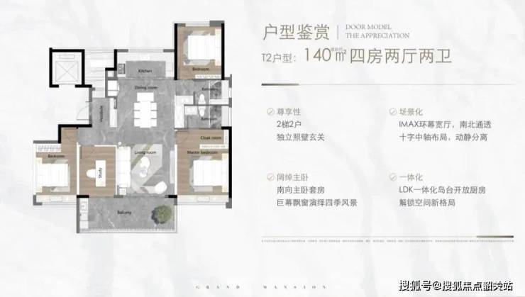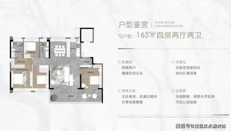 165㎡同样做了四房,整体布局有点类似140T3户型的放大版,不同之处是设置了转角玄关,而且屋内的长阳台也是户型亮点。