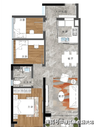 1. 83-84㎡南向三房两厅一卫(带入户花园):该户型为刚需首选,布局紧凑、利用率高,无浪费空间。整体朝南,采光通风极佳,客厅连接阳台,可享受充足的阳光和视野;入户花园设计,既能作为玄关使用,放置鞋柜、杂物,也能打造小型休闲区,增加户型实用性;三个卧室均朝南,空间宽敞,主卧搭配飘窗,提升居住舒适度,儿童房和次卧空间适中,可满足家庭日常居住需求;卫生间干湿分离,布局合理,避免潮湿困扰,适合三口之家居住。该户型最大特色是户户朝南,带入户花园,性价比极高,首付压力小,适合刚需首套购房者。