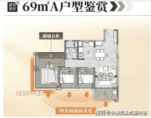 69㎡南北流三房:尽管面积较小,但通过巧妙的空间布局实现了南北对流,并且拥有双面江景。客厅开间约3.15米,若打通一个卧室,则可形成约20平方米的大方厅,主卧面积约17平方米,带有L型飘窗,可眺望白鹅潭城市景观。