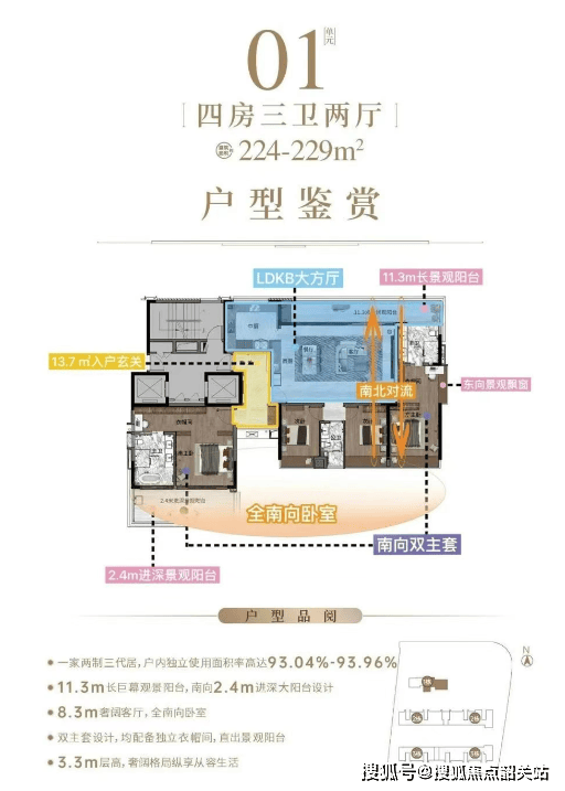 **居住空间舒适感**:户型为130-229㎡,户型方正,动静分离,动线合理。两梯两户板式布局,超宽景观阳台,带来舒适的居住体验。小高层8楼以上新规产品提升了空间使用率,叠院产品空间私密,居住在此能充分享受宁静与惬意。