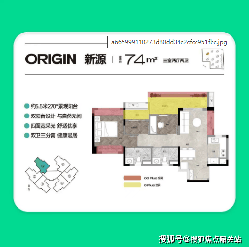 约74㎡三房两厅真两卫:5.5米大阳台,四开间采光,超83%标准层实用率。