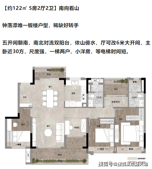 约122㎡五房两厅两卫:唯一板楼户型,稀缺好转手,南北对流双阳台,高层望帽峰山。