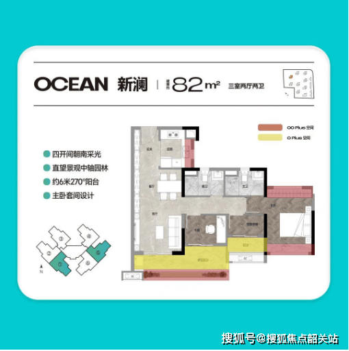 约82㎡三房两厅两卫:南向看山,6米大阳台,四开间朝南,主卧双飘窗。