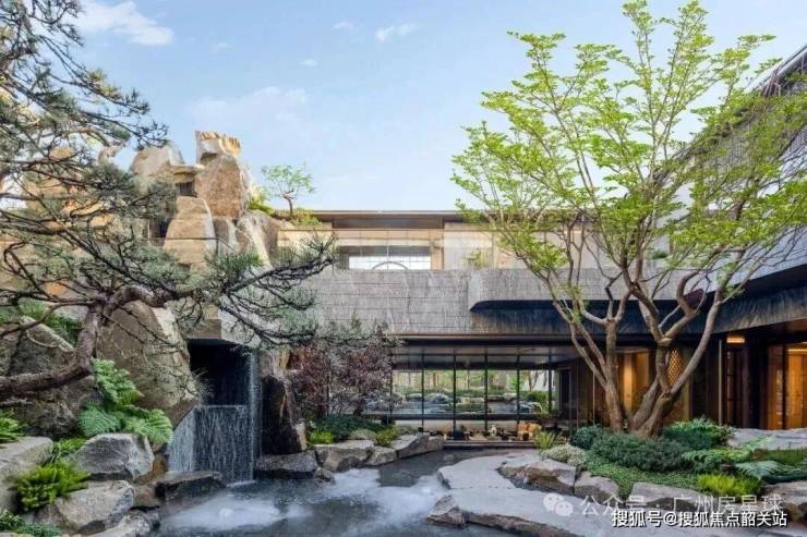 作为三进阶归家礼序的收尾,下沉式庭院“中天云庭”,完美诠释了“石为骨,水为魂”的岭南园林意境,宛如一幅流动的岭南山水画被具象化到了现实之中。整个园林空间借鉴了余荫山房的古树之姿与造园智慧,运用岭南园林“藏水于庭”的造园手法,将山涧、树影、曲桥、流水、亭台融为一体,打造出了层次丰富、一步一景、步移景异的园林景观。