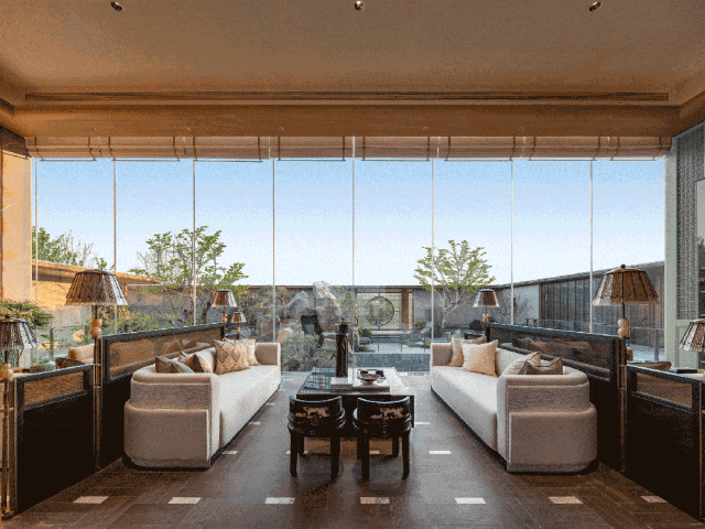 会所内的会客厅“文昌阁”,更是被设计成了一座沉浸式的“岭南四季自然博物馆”,空间采用大开窗设计,将室外的园林景观与自然光影引入室内,打破了传统室内空间的封闭感,实现了室内外景观的自然融合。坐在文昌阁内,抬眼便能看到室外的园林景致与湖光水色,四季的更迭、自然的光影都能尽收眼底,让整个空间充满了自然的气息与灵动的质感。同时,大量岭南文化与自然元素的细节嵌入,让这里不仅是一个会客社交的空间,更成为了社区内的学习交流空间,让教育与文化氛围自然延伸至业主的日常生活之中。