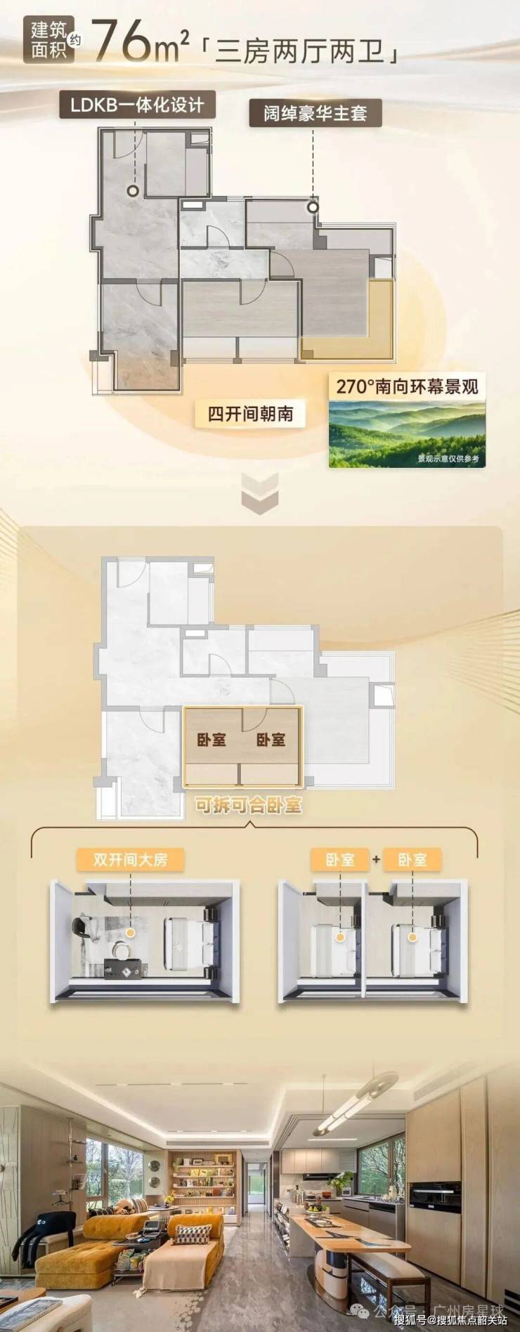 以全新升级的建面约76㎡三房户型为例,这款户型经过了数次优化升级,在空间设计上充分考虑了广州购房者的居住习惯,实现了空间利用率的最大化。户型采用了LDKB一体化的宽厅设计,将客厅、餐厅、厨房、阳台打通,形成了一个开阔的家庭共享复合空间,既可以满足日常的起居、用餐、烹饪需求,也可以根据家庭需求打造亲子互动、休闲娱乐等多元场景,让家庭公共空间的使用更加灵活。