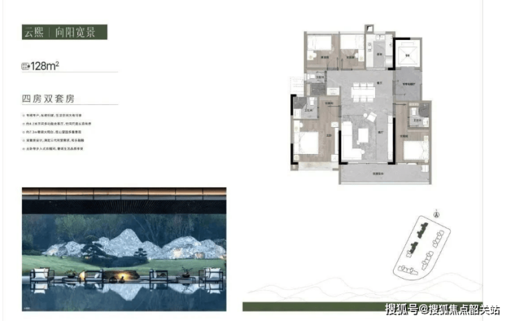 128㎡四房三卫:专梯专户,私密归家,约4.2m开间多功能会客厅,空间尺度从容有序。约7.3m奢阔大阳台,揽山望园多重景观。