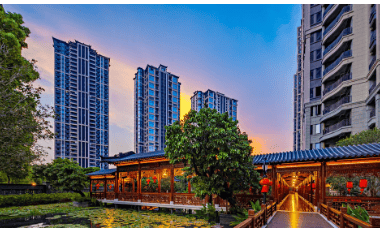 园区内的半岛五號古典园林更是匠心独运,一半人工雕琢,一半自然天成。融合晋派与徽派建筑的传世匠心,既有晋派的恢宏大气,又有徽派的精巧细致。数十块奇特景石营造延绵山脉之效,全冠移植的超大乔木、姿态各异的花卉植被,浓缩成 “千里江山尽在此园” 的绝美意境。大型亲水荷塘以水为核心,搭配高大乔木、富贵绿石及英石,再衬以大量荷花等水生植物,园林与建筑相得益彰,美轮美奂。满工雕花的精湛工艺,从精挑细选的陶瓦屋顶、进口柚木木作及地板,到聘请苏州非遗工匠打造的艺术品级雕花,无一不彰显着极致的品质。寻遍华南搜罗而来的形态婀娜的飘水荔枝树、高大挺拔的秋枫等名树,打造出园中的名树博物馆。叠石造景更是百里挑一,以自然山水为蓝本,运用景石与水系浓缩山水之美,体现师法自然的优雅情趣。