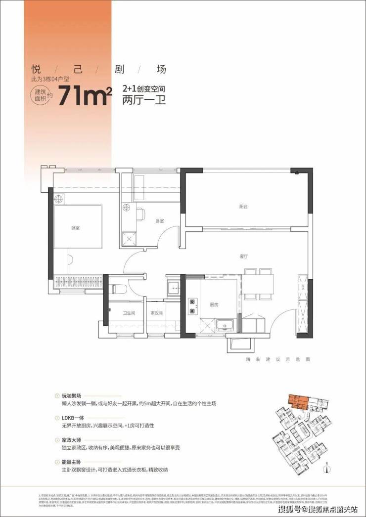 71㎡的2 + 1创变空间2厅2卫,为悦己主义者打造了个性化的家。客厅约5m超大开间,是自在生活的个性主场,居民可以在这里尽情享受休闲时光。LDKB一体化的设计,将厨房、餐厅、客厅和阳台等功能空间融为一体,增加了空间的通透感和互动性,同时还提供了兴趣展示空间。独立家政区让家务变得有序、美观且便捷,主卧双飘窗设计可打造嵌入式通长衣柜,提供了精致的收纳空间。