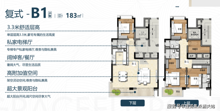 复式户型:包括164㎡、167㎡、175㎡、183㎡等多种面积段,满足对空间有更高要求的业主。