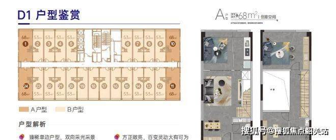 户型设计亮点满满,得房率超高。53 - 68㎡全能空间,4.5 米中空挑高,空间奢阔且百变,能根据不同需求进行改造,实用率超 150 + %,投资价值高。35 - 68㎡冠军居所,超低总价,不限购不限贷,无论是单身人士自住,还是投资者入手,都很合适。每个户型都充分考虑了空间利用和市场需求。