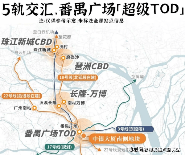 地铁站:项目自带番禺广场地铁站E口,作为18号线、22号线、3号线、3号线东延段、17号线(规划中)的交汇站,轨道“黄金链”之上,通勤顺畅便捷。