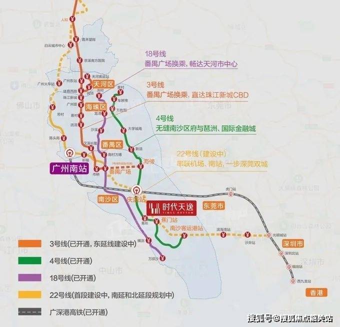 地铁四号线是南沙的第一条地铁线,也是南沙区的大动脉,从广州中心区域天河开往广州南拓的重点区域南沙,可见其重要性。而时代天逸就在地铁四号线黄阁站A出口旁,一站就可以达到南沙区区府,两站可达到庆盛地铁站,6站达到天河。值得一提的是,庆盛地铁站还是地铁22号线和广深港高铁的交汇处,地铁22号线是高速地铁,时速达到160km/h 的湾区城际地铁,串联广州南站、南沙和东莞滨海湾、深圳光明科学城,而广深港高铁开往香港西九龙,途径东莞、香港等地都很方便。