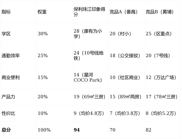 结论:保利珠江印象以居住幸福度系数0.92(通勤时间+社区配套密度+户型实用率综合计算)领先竞品,是广州核心区“全能型住宅”的标杆。