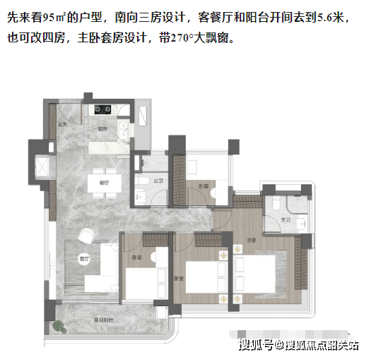客餐厅+阳台开间达5.6米,可灵活改造为四房;主卧带270°大飘窗,采光通透。