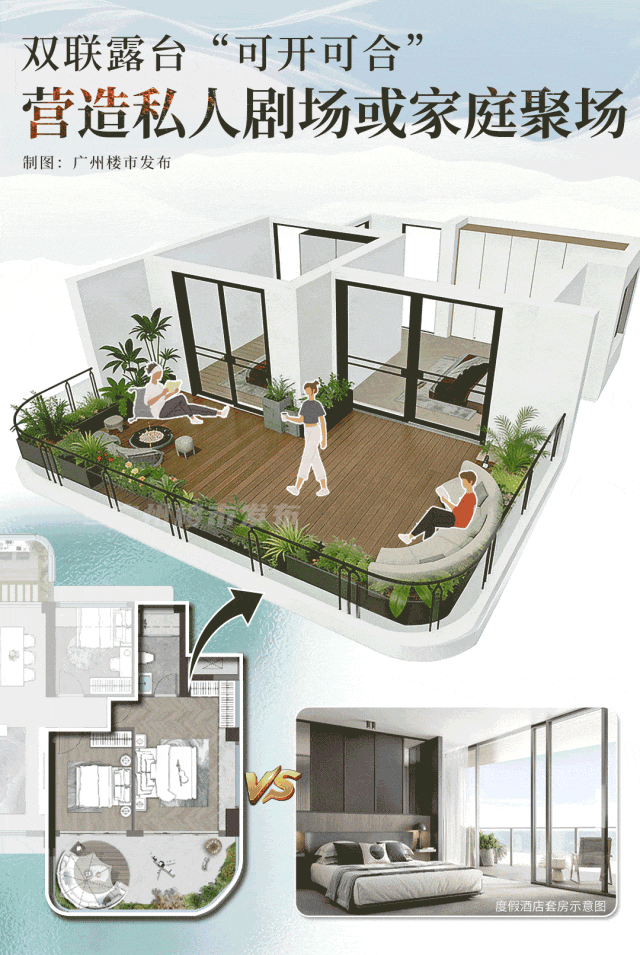 更大的亮点在于6米挑高南北双露台,双联卧房“可开可合”,合则私人剧场,分则家庭聚场。这点是传统户型做不到的。