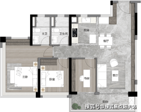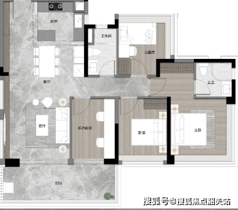 约85㎡三房两卫户型,采用LDKB一体化空间设计,打造约42㎡互动空间,实现客厅、餐厅、厨房、阳台联动,拓展家庭活动空间;配备超6米阔景阳台,景观视野开阔,采光通风效果极佳,可打造休闲观景区或生活功能区;户型方正实用,动静分区清晰,卧室空间舒适,双卫设计满足多人口家庭使用需求,避免早高峰拥堵,是刚需家庭的优质选择。