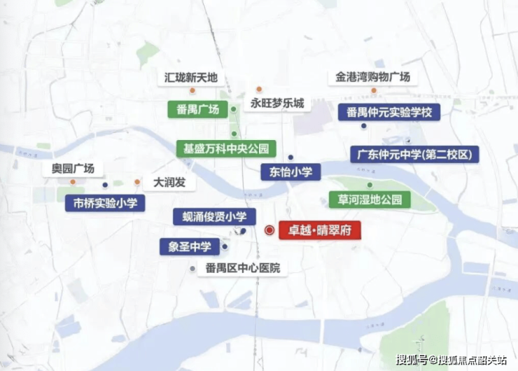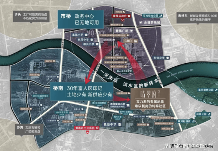 桥南板块,上世纪 90 年代便已崭露头角。金业别墅、新世纪花园别墅、德宝别墅等低密老派别墅相继入市,奠定了其作为番禺传统富人区的坚实地位。2003 年后,万科、保利、雅居乐等知名房企纷纷加码,海伦堡御苑、祈福水城等品质小高层社区如雨后春笋般崛起。然而,自 2015 年后,除时代柏林外,桥南板块新房供应几近断档。直到 2021 年 4 月第一次集中供地,番禺桥南街蚬涌村大口涌以西地块引发十家房企激烈角逐,最终卓越集团脱颖而出,以总价 299656 万元、楼面价 24705 元成功竞得,打造出卓越晴翠府这一力作。