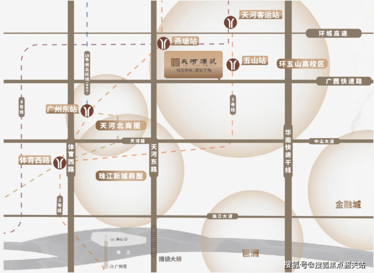 世纪金源·天河源筑位于天河北五山板块,与华南理工大学五山校区毗邻,周边汇聚广州多所知名高校,包括华工、华师、华农和暨大,区域学术氛围浓厚。项目距离珠江新城核心商务区约4.5公里,车程约15分钟即可直达,兼顾城市核心生活便利与生态宜居体验。