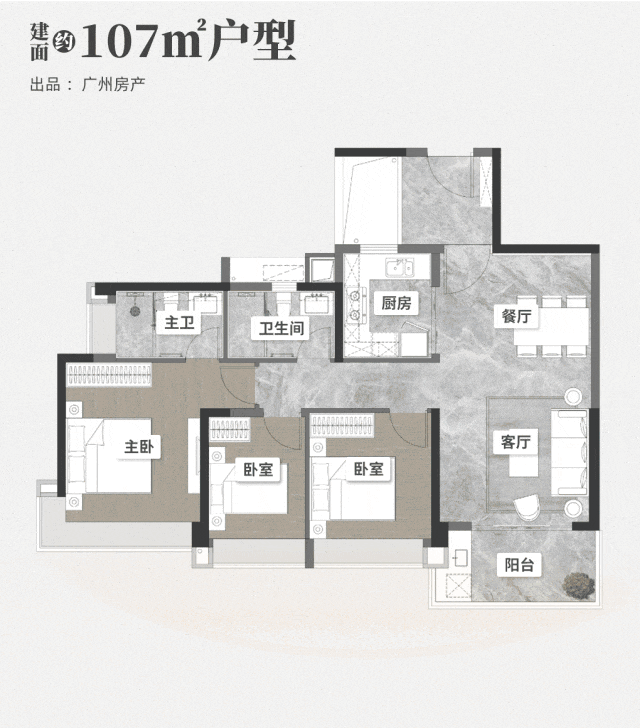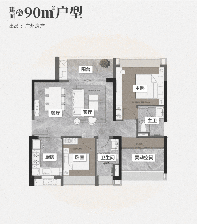 建面约98㎡三房:南向三开间,得房率86%,主卧套房设计,适合三代同堂。