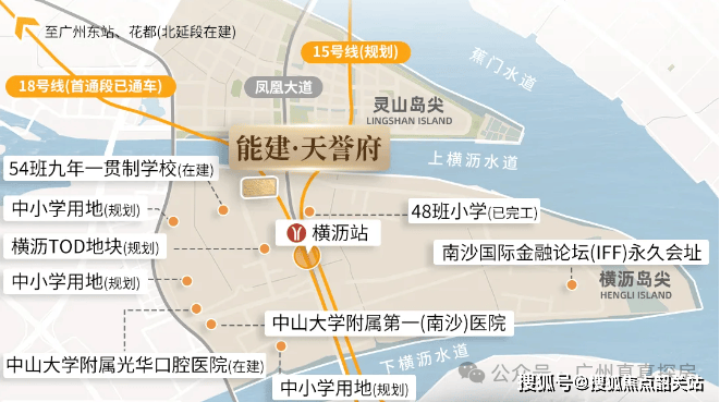 项目直达距离横沥站(15/18/32号线三地铁交汇)约400米,其中18号线已于2021年开通,15号线出现在广州地铁四期的申报目录里面,32号线则是中长期的规划,临近广澳高速、南沙港快速路,可快速到达广州市区、东莞、佛山、中山等城市,交通十分便利。