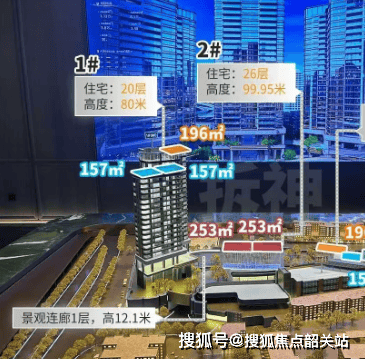项目共规划 3 栋高层住宅,呈一字型排布,保证了每栋楼的采光和通风效果。1 栋位于小区西侧,20 层高,两梯三户设计,做到了专梯专户,户型涵盖 157 平方米和 196 平方米。2 栋位于小区中央,是项目的楼王单位,26 层高,两梯两户设计,户型全部为 253 平方米大平层,层高达到 3.3 米,比普通住宅的层高高出 0.3 米,空间感更加开阔。3 栋位于小区东侧,24 层高,同样为两梯三户设计,做到了专梯专户,户型涵盖 157 平方米和 203 平方米。